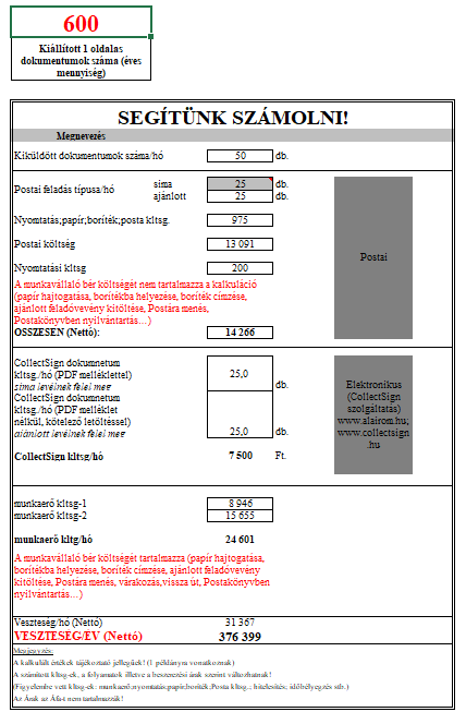 A mellékelt példában az alairom.hu oldalon található SX csomaggal kalkuláltunk, amely éves szinten 600 db dokumentum mennyiséggel számol. Nagyobb éves mennyiség esetén kedvezőbb árat tudunk biztosítani!