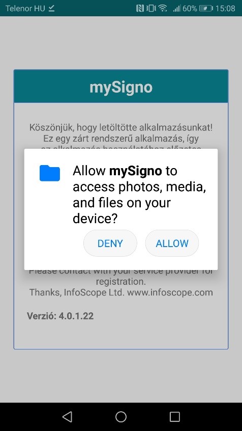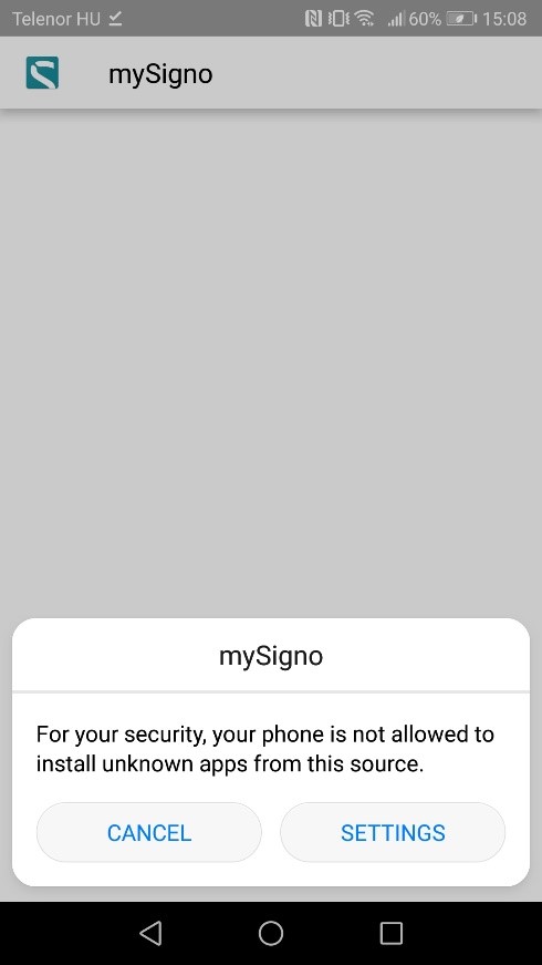 - engedélyezni kell az eszközön az ismeretlen alkalmazások telepítésének lehetőségét a mySigno SignPad alkalmazás számára IS! Elképzelhető, hogy az Android rendszer ezt megkönnyíti és egymás után felajánlja a ehhez a lépéseket.