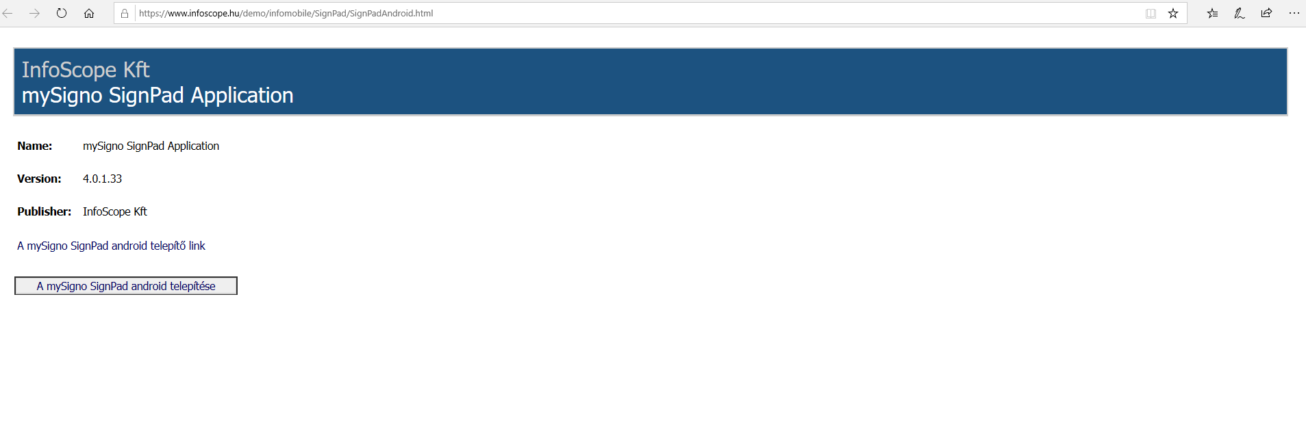 A telepítő letöltése az „A mySigno SignPad android install” gombra kattintva indítható.