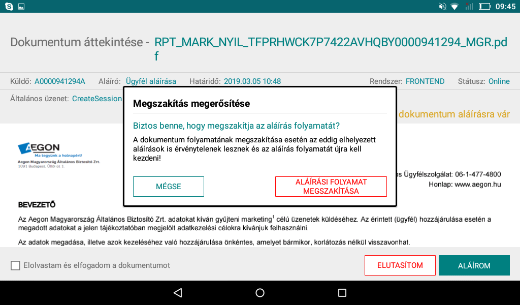 Az aláírási folyamat megszakítható az Elutasítom gombra kattintással. Ezután megerősítő ablakban végleges döntést hozhat a felhasználó a dokumentum aláírási folyamatának megszakításáról. Ha egy aláíró megszakítja a folyamatot, az többet nem írható alá.