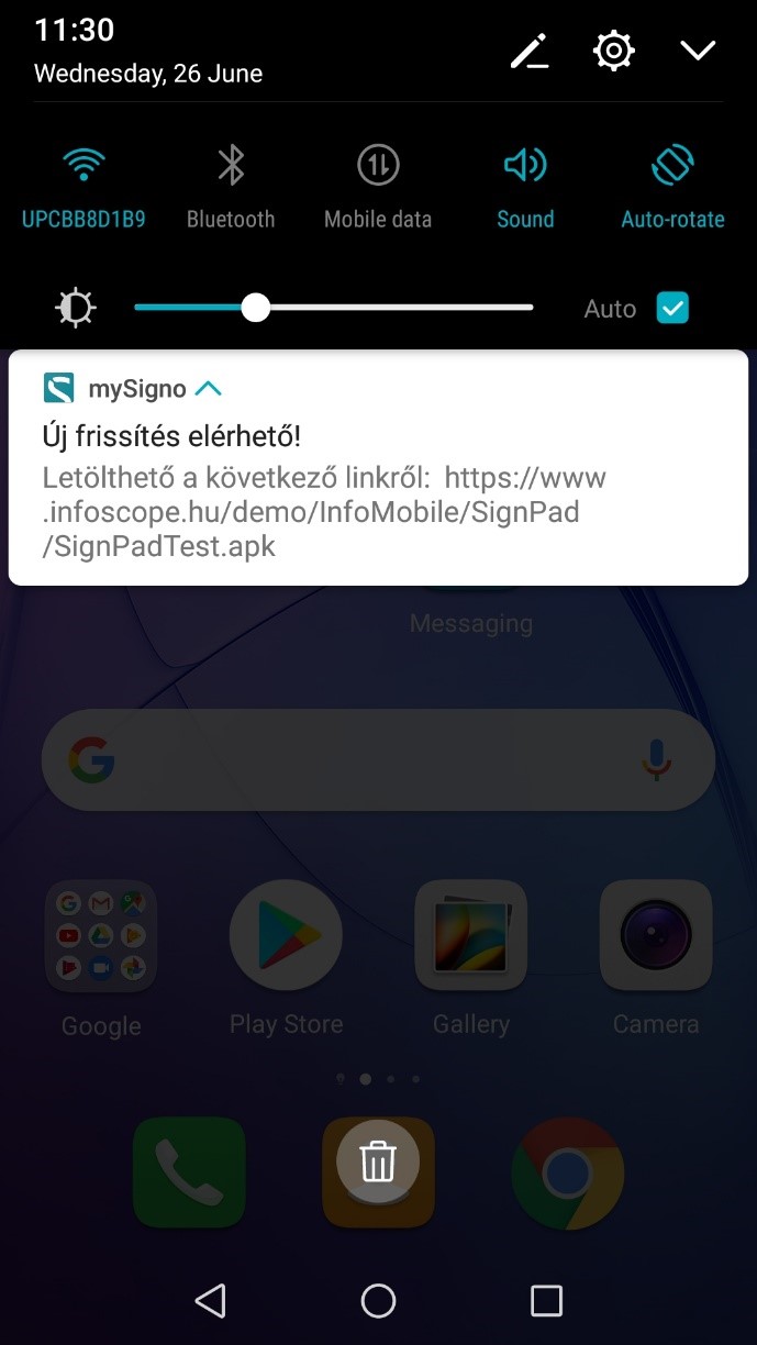 Az Android rendszerű eszközökre PUSH notification (értesítő üzenet) küldhető központilag a mySignoAdminSite használatával. (Ennek rendje és módja a mySigno üzemeltetői dokumentumban található részletesen.)