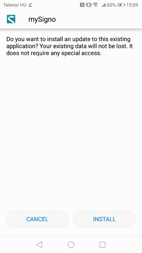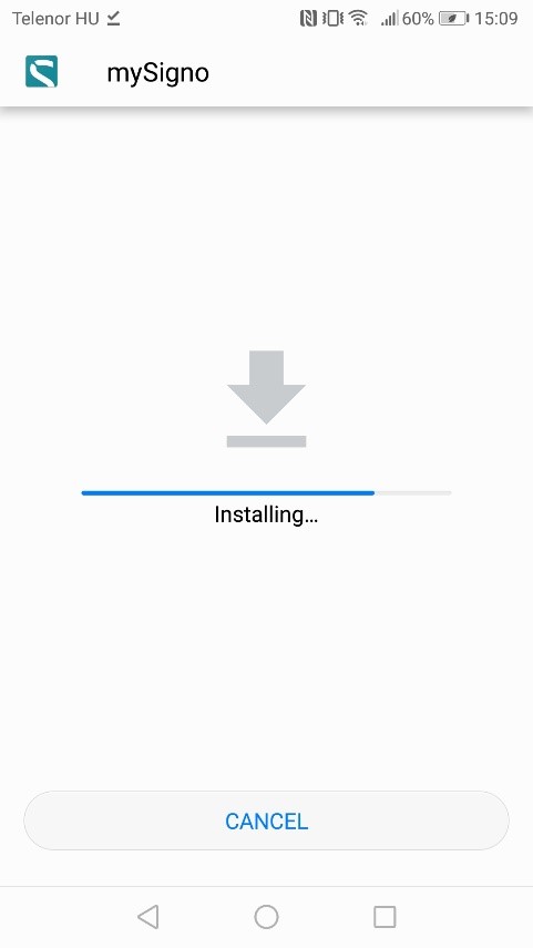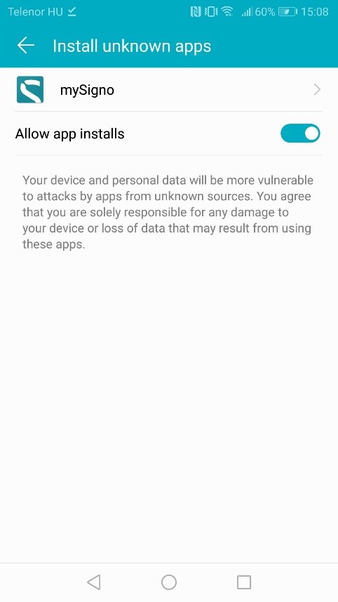 - engedélyezni kell az eszközön az ismeretlen alkalmazások telepítésének lehetőségét a mySigno SignPad alkalmazás számára IS! Elképzelhető, hogy az Android rendszer ezt megkönnyíti és egymás után felajánlja a ehhez a lépéseket.