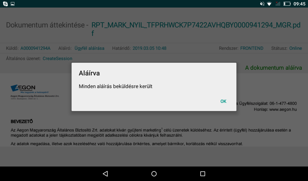 Az aláírás véglegesítése után a SignPad visszajelzést ad a beküldés sikerességéről.